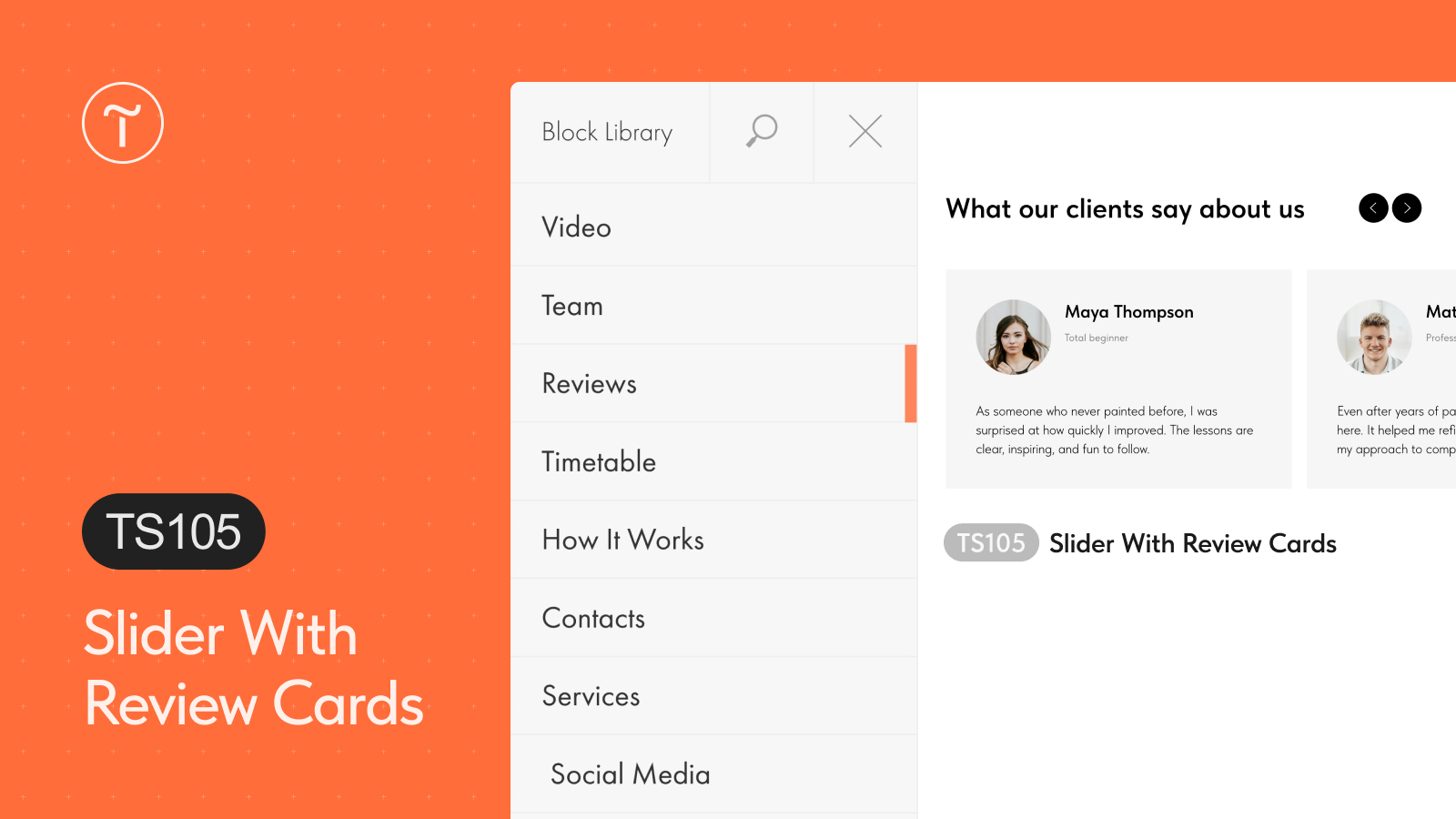 Use the new TS105 Slider with review cards block from the Review category to share your users' or clients' testimonials. You can upload an image, add text and buttons, adjust card width, customize arrow styles, etc.
