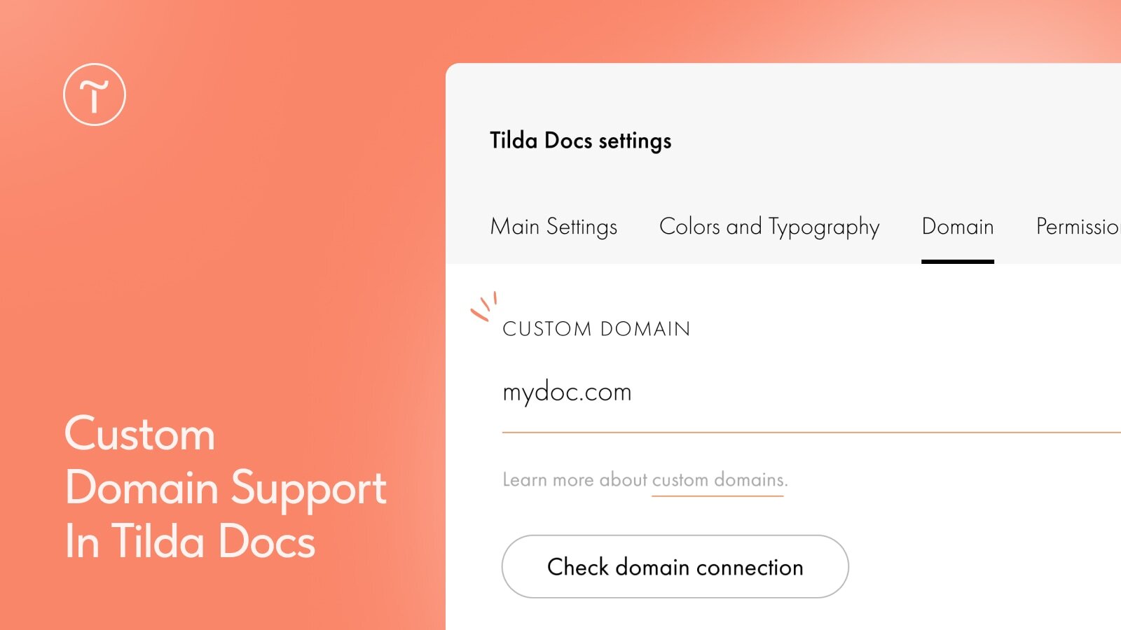 To set it up, go to Tilda Docs Settings → Domain → Custom Domain.