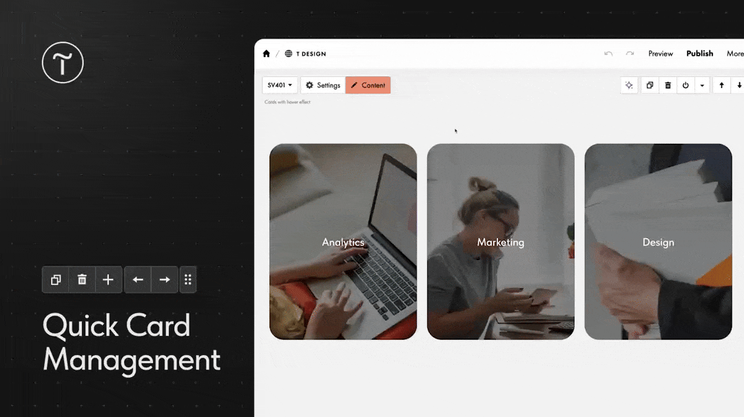 Blocks with cards and tile galleries now have a widget that lets you quickly duplicate, delete, move cards and images, or add new ones. Just hover over an element to reveal the widget and choose an action—no need to open the Content tab.